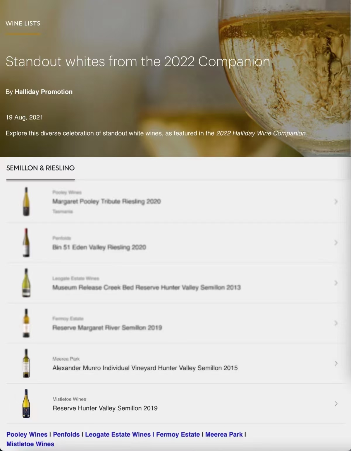 猎人谷赛美蓉: 经典的、具有穿透力的干型赛美蓉。年轻时清新、带有柠檬、青草气息,酸度凛冽;陈年潜力惊人,经(5-20+年)陈年后会发展出蜂蜜、烤面包、坚果等复杂而迷人的层次,被誉为澳大利亚白葡萄酒的瑰宝!