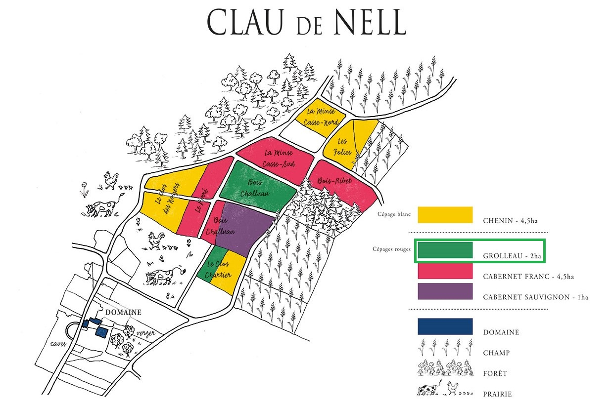 酿酒葡萄来自酒庄附近的葡萄园,位于卢瓦尔河谷海拔101米的高处,葡萄园土壤为粉质黏土,包含凝灰岩(石灰岩)上的粗砂砾与红色燧石。园中葡萄藤均龄百年。Grolleau地块占地仅2公顷左右,园中管理全程采用生物动力应用,并根据生物动力日历的节奏来完成。产量约25 HL/公顷。