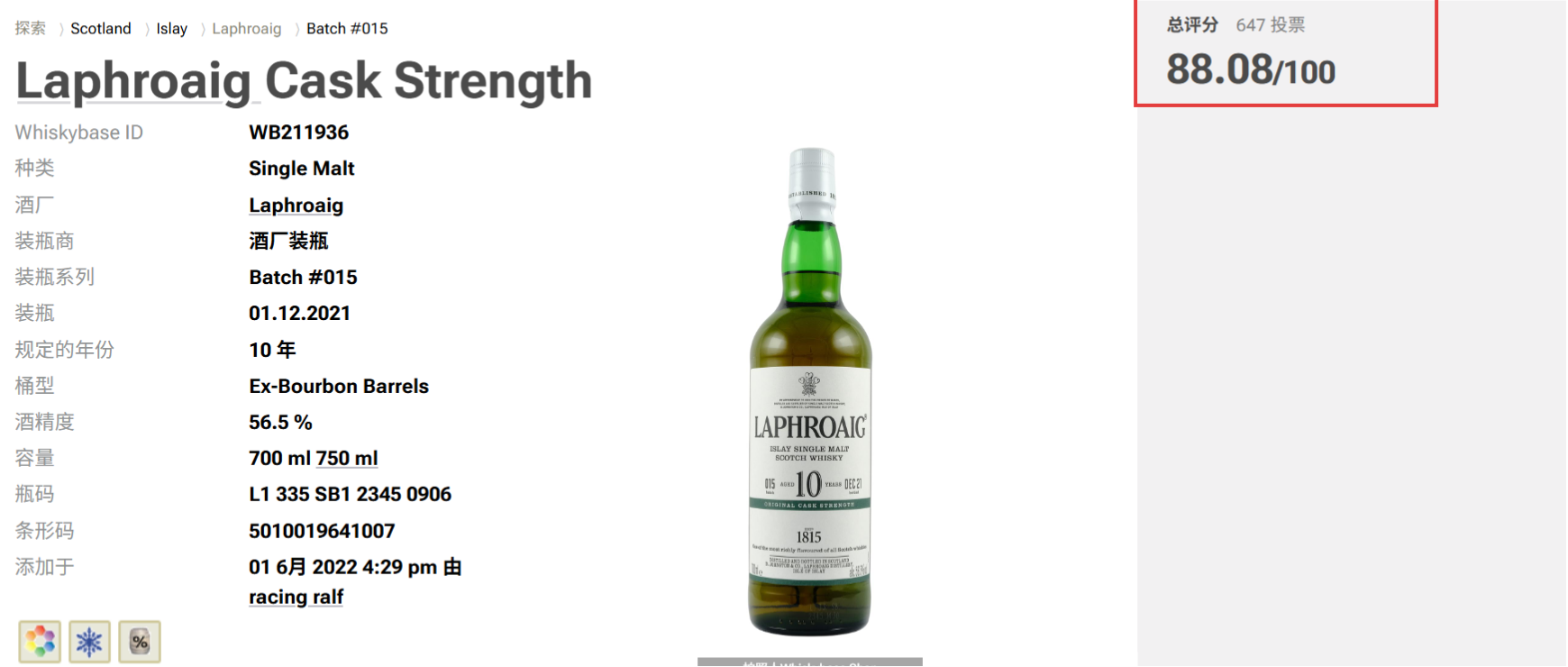在知名威士忌收录网站Whisky Base上多达647票打出来88.08分,这对于一款OB 批次桶强来说,这个分数极具分量,足以证明它的品质之高了!