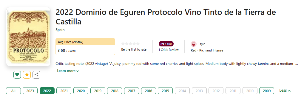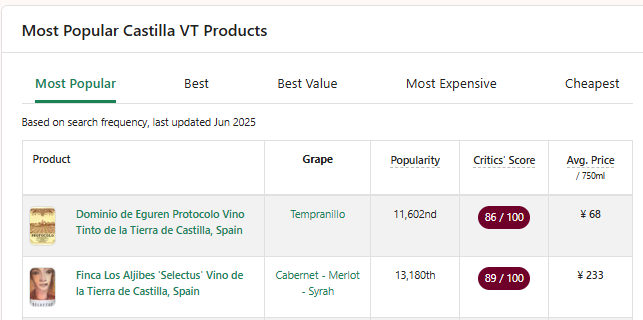 ⭐ 全球超流行:在全球葡萄酒知名搜索神器Wine-Searcher的西班牙Castilla VT产区“流行榜单(Most Popular)”中,该款酒排名第一,价格还是第二名的四分之一左右,酒标更是大气端庄,轻松适配各种场合,难怪在全球如此流行!