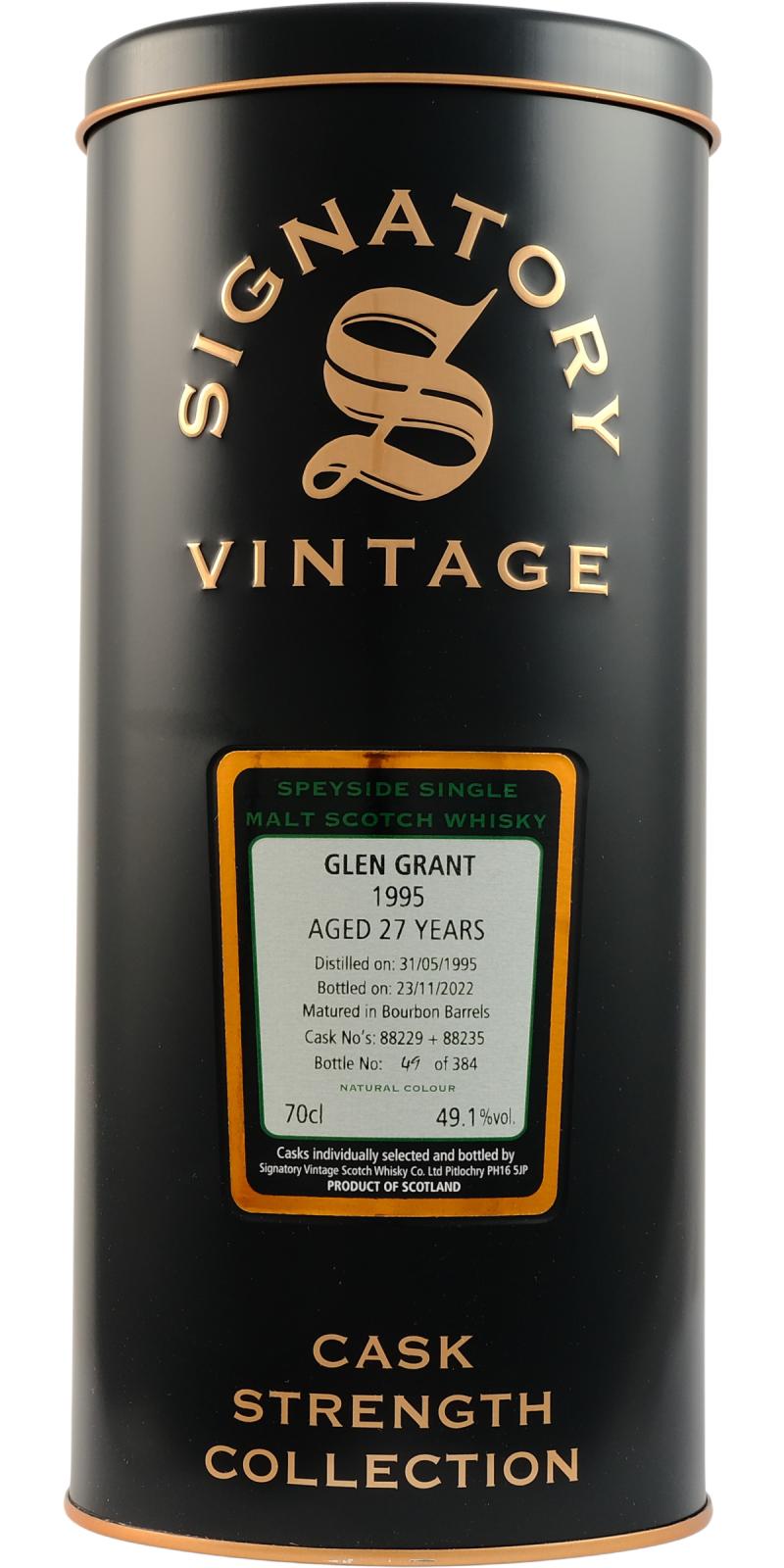 其原酒源自斯佩塞标志性酒厂格兰冠,于1995年5月31日蒸馏,在两只波本桶(桶号#88229与#88235)中静静陈酿逾27年,直至2022年11月由Signatory Vintage以原桶强度装瓶。