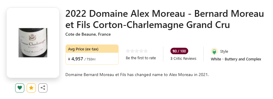【低均近260!勃白名家稀缺大酒,翘楚名园科通查理曼!】Alex Moreau Corton Charlemagne Grand Cru 2022