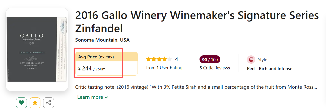 【挥泪清仓!国均4.9折!嘉露高端臻印系列,奔放甜美正值适饮顶峰期!】Gallo Winery Winemaker's Signature Series Zinfandel 2016 单支/双支/六支装