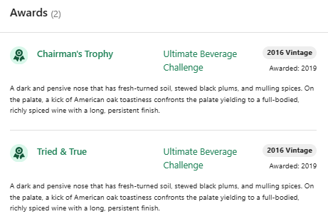 2016年份在产区大年加持下,拿到JS & WA & WS 91分!更有Ultimate Beverage Challenge主席奖杯和经典之选双项大奖背书!