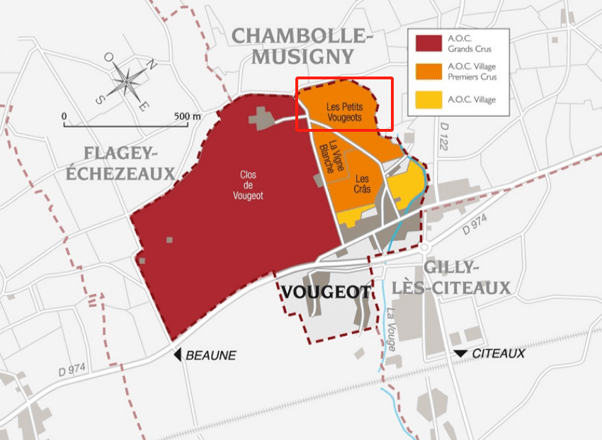 Les Petits Vougeots一级田该村其他一级田相比并无太多特色,质量也比较平庸,一般出产的葡萄酒香气程度会略优于口感。