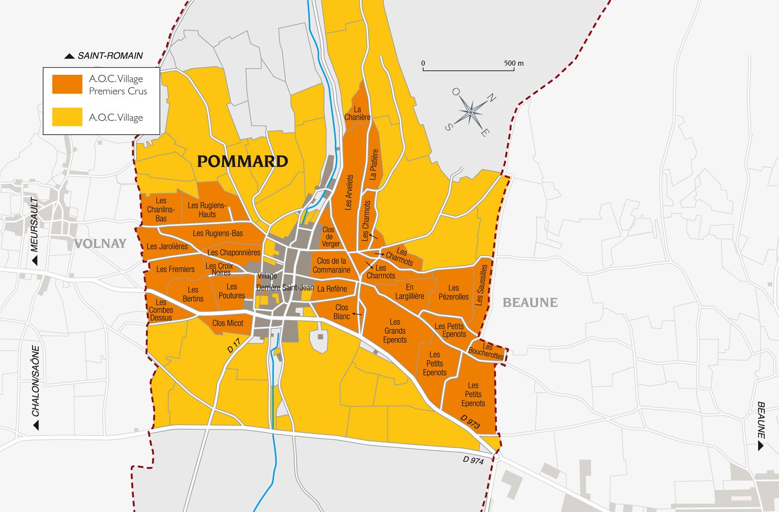 属于金丘的伯恩区。葡萄园位于Pommard村内,该产区拥有28个一级园,最为有名的就是Les Rugiens和Les Epenots。 绝大部分的人甚至是勃艮第的忠实粉丝都会有种先入为主的观念,认为伯恩区Pommard的酒体强壮且男性化。事实上,随着时间的推移,当地的风土和种植方法都在不断演变,致使Pommard的酒体变得更加饱满和细腻。颜色非常深,伟大的作家雨果将其比喻作与白天抗衡的晚上。它的香气芬芳,带有黑莓、覆盆子、醋栗、樱桃核和成熟李子的味道。成熟之后,它会衍生出皮革、巧克力和胡椒的味道。它需要充分的时间在瓶中发展,以达到最佳的状态,果味逐渐褪去演变成为层次感和复杂度,单宁变得有咀嚼,质地细腻顺滑。