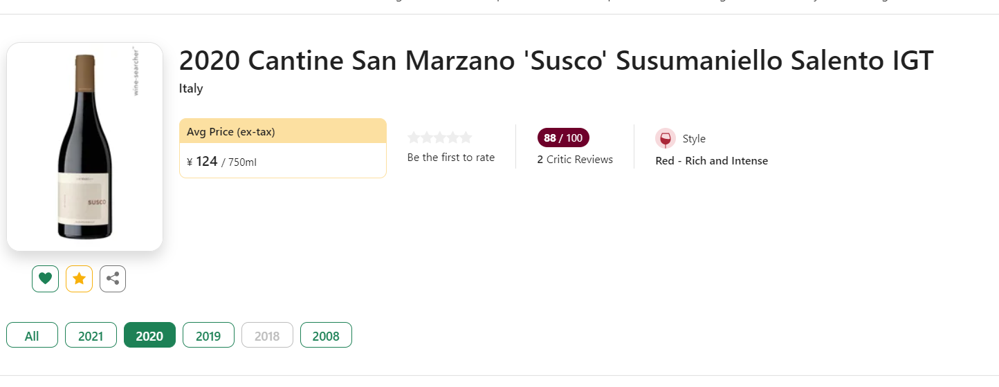 【滴血特卖!!国均7.9折!Vinous钦点“南意至具突破性酒款”】Cantine San Marzano 酥酥干红葡萄酒 2020 单支/六支