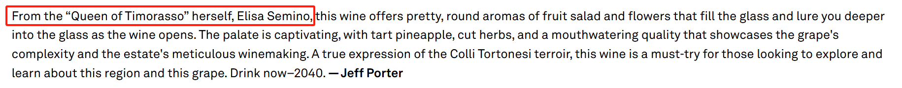 WE更是在酒评词中直言:“真正体现了Colli Tortonesi的风土特色,是那些希望探索和了解该地区和这种葡萄的人的必备之选”!