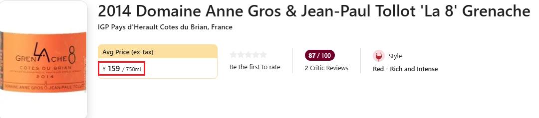 【国均5折!CC三星名庄夫妻联袂!WA:勃艮第风格的歌海娜!】Domaine Anne Gros & Jean-Paul Tollot 'La 8' Grenache 2014