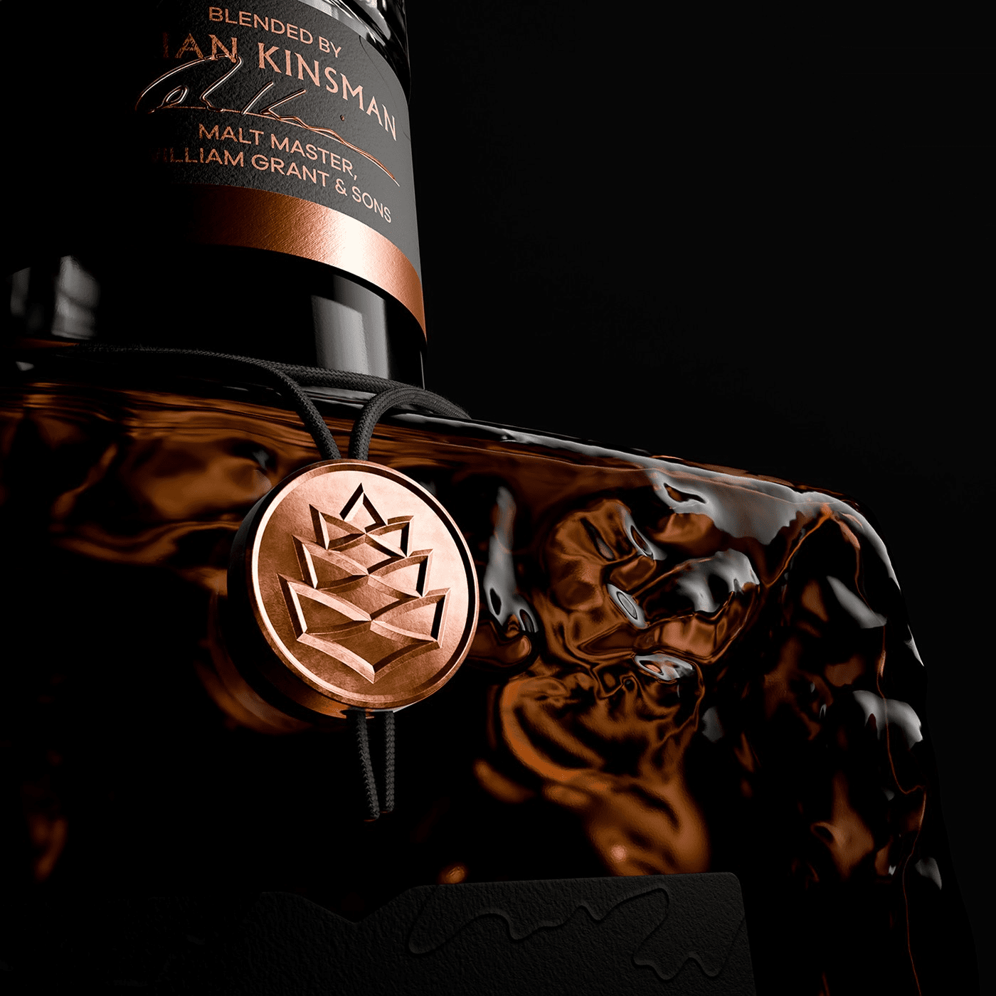 在木制瓶头上方有着远慕的品牌标志「松果」,松果是苏格兰荒野中常见的植物之一,象征造就苏格兰辽阔景致背后的自然之力,以及造就威士忌风味至为关键的橡木桶; 周围烙印着“Decades in the making. Now set free.」字样,正式宣示格兰父子家族窖藏正式问世。