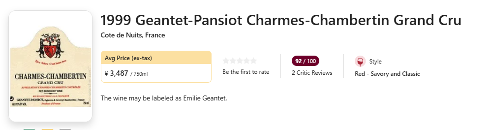 【低均近900!老牌大咖“双狗抱树”,老年份CC特级园!】Geantet-Pansiot Charmes-Chambertin Grand Cru 1999