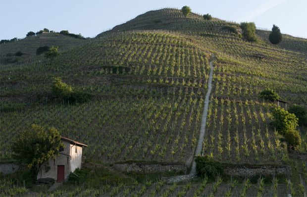 由北往南奔流而下的隆河在单-埃米塔日镇突然向东转了一个大弯,把左岸的山坡刻蚀成一片照满阳光的向南坡地,山势垂直陡峭,自河岸拔高两百多公尺,葡萄就种在险峻高悬的梯田之上。狭迫的地型无法使用机械,几乎只能由人力耕作,比起平地上的葡萄园艰困许多,不过,陈年埃米塔日红酒的迷人滋味确实也让这些努力变得值得,只是,陈年所需等待的时间却相当长,少则十年,多则数十年之久。