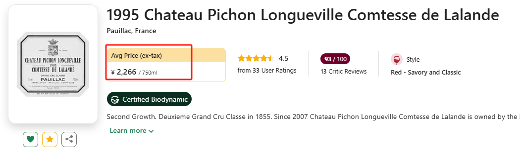 【白菜价波尔多!国均8.8折!超二女爵正牌,准满分老年份!】Chateau Pichon Longueville Comtesse de Lalande 1995