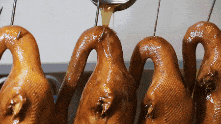 再把鹅放入熬制好的卤水后,反复将鹅挂起离汤四次,每次约相隔半小时,这样才能使卤汁完全封锁在鹅肉中。
