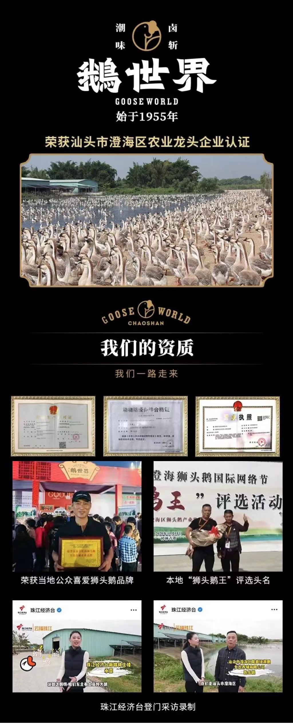 鹅世界作为潮汕本地狮头鹅养殖业的龙头企业,拥有数百亩高度自动化且更加生态环保的养殖基地,在传统的养殖方式基础上与多所高校及研究机构合作开发更科学的养殖方法。