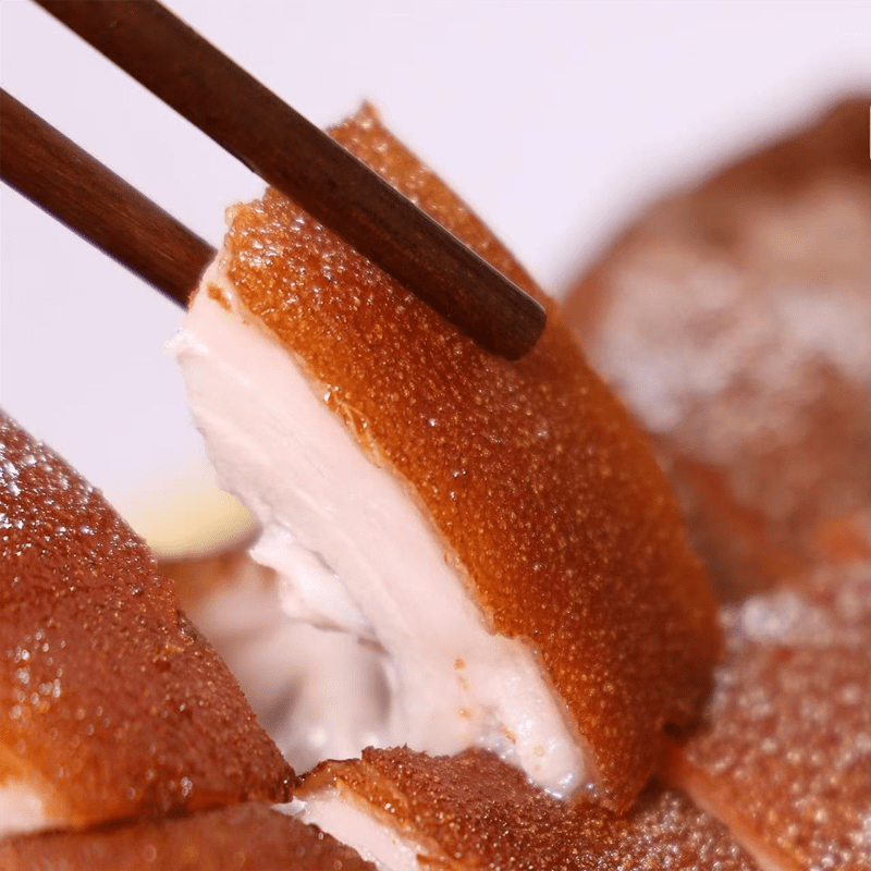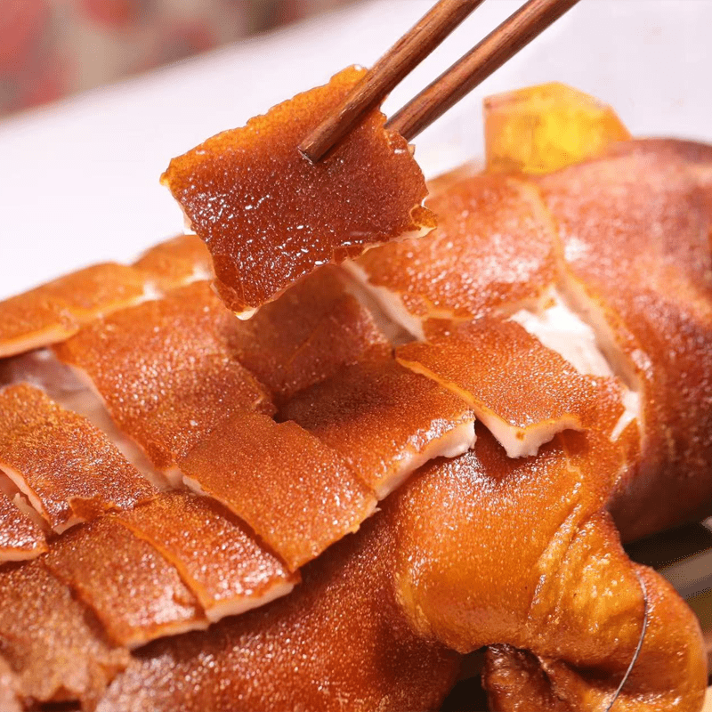 慢腌后的乳猪会被送入特制的烤炉中,通过低温慢烤与高温脆皮两种火候相结合,让乳猪表皮金黄酥脆,色泽如琥珀般诱人。烤制过程中,师傅需要不断调整乳猪的位置与角度,同时刷放酱料,确保烤出来的每一头乳猪“色同琥珀、又类真金”。