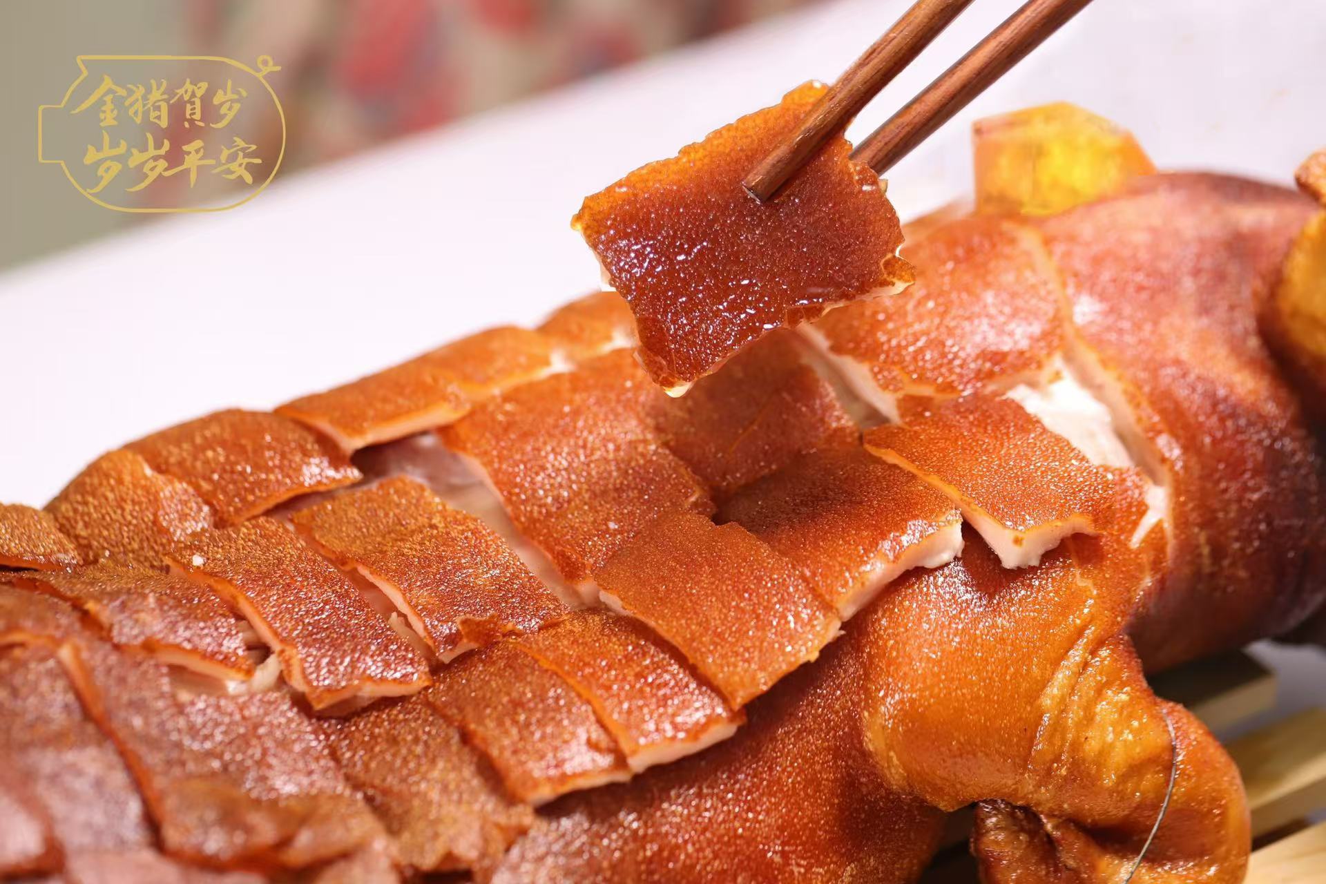 独特的腌制配方和烤制工艺赋予乳猪馥郁迷人的油脂香、细腻的肉香与天然香料香,香气四溢,光闻着就让人垂涎三尺!