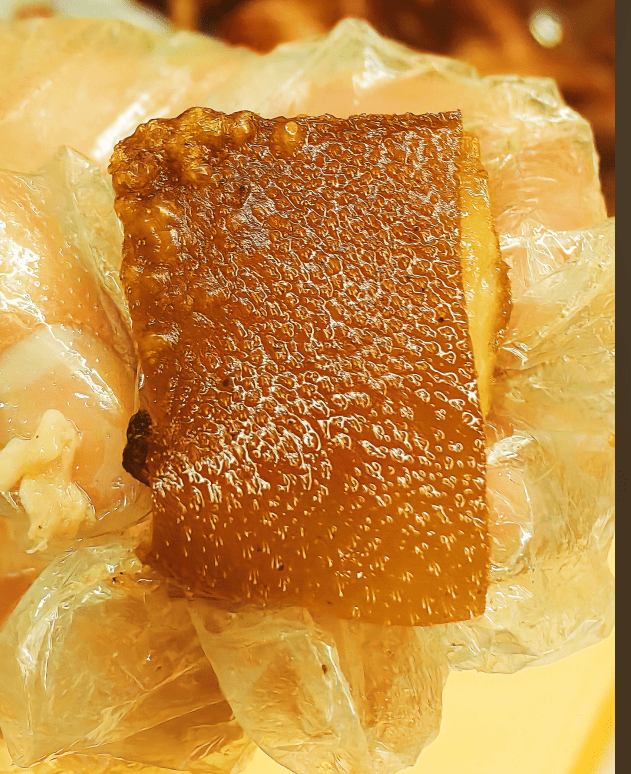 烤乳猪颜色金黄、色泽油亮,表皮酥脆,用贾思勰的说法来说: “色同琥珀,又类真金”,极其诱人!