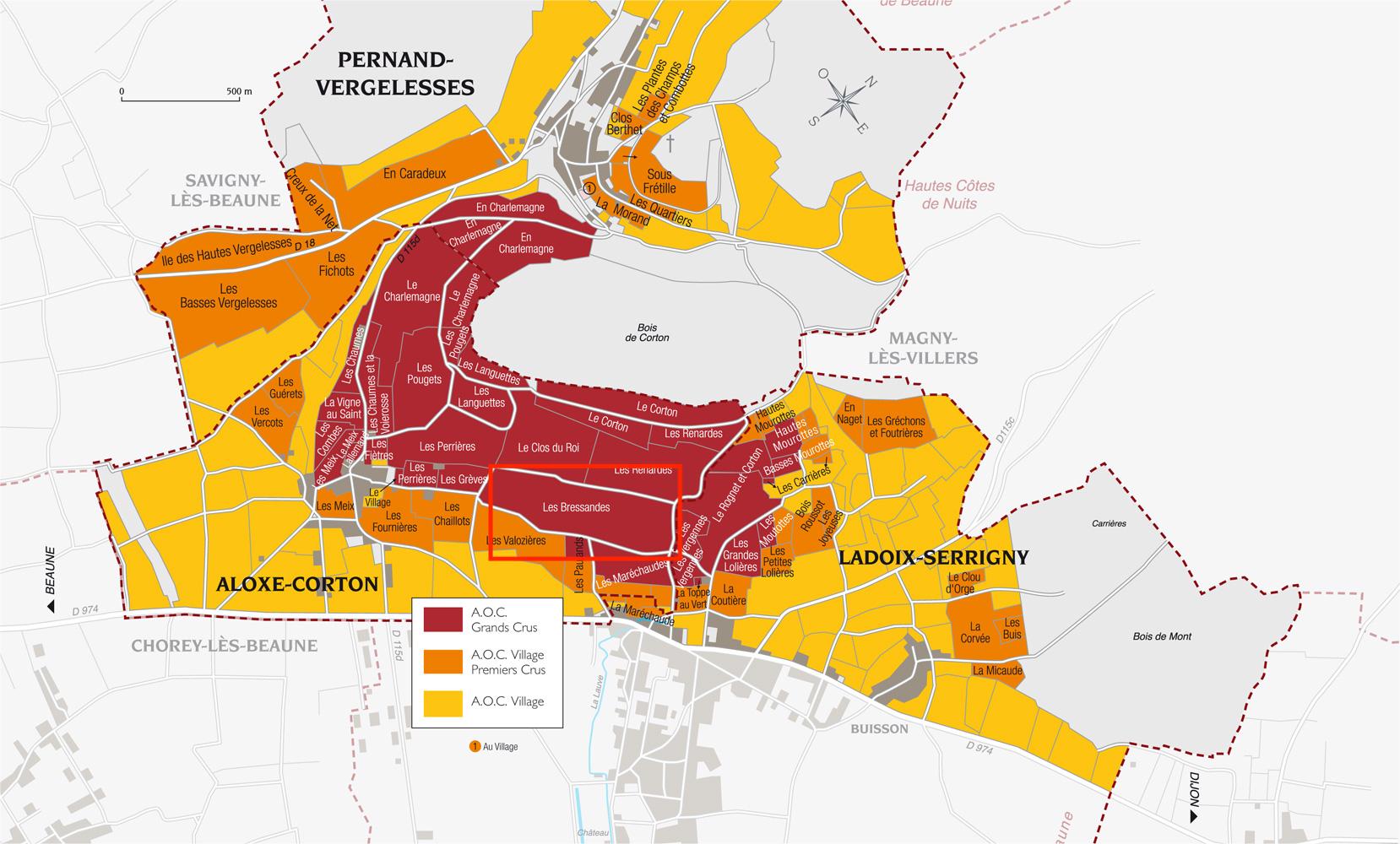 当初虽未被葡萄酒专家Lavalle以及Rodier列为高级,但今日Bressandes与位于其上坡处的Le Clos du Roi被认为是Corton品质上乘的地块,陈年潜力出色,连罗曼尼康帝都在这个地块上酿酒!