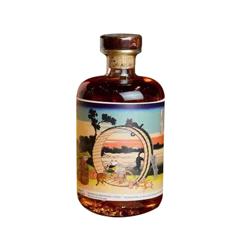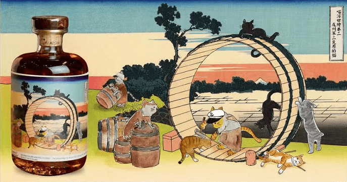 尾州,就是现在的名古屋,这张名作经过喵化之后,原本在海上乘风破浪的船长带领着猫船员们一起化身为木匠职人,敲敲打打制木细节可是一点都不马虎。画面上一群猫咪桶匠正在加紧赶工大木桶(Vattingtun),准备进行威士忌的调和工作,画面左边的4个小橡木桶暗示这款调和麦芽威士忌采用来自4家威士忌酒厂的酒液进行调和——Bunnahabhain布纳哈本、Ledaig里爵、Tamdhu檀都、Tomatin汤玛丁。