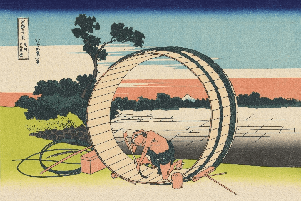 《尾州不二见原》源自于世界知名日本浮世绘画家葛饰北斋创作的木刻版画,是富岳三十六景系列作品之一。田野外远处是富士山,木桶工匠背靠富士山,一心一意地制作木桶,在大木桶的圆圈中则可以看到一个三角形的小富士山,葛饰北斋巧妙展现了正圆与三角形对比的趣味的图象。