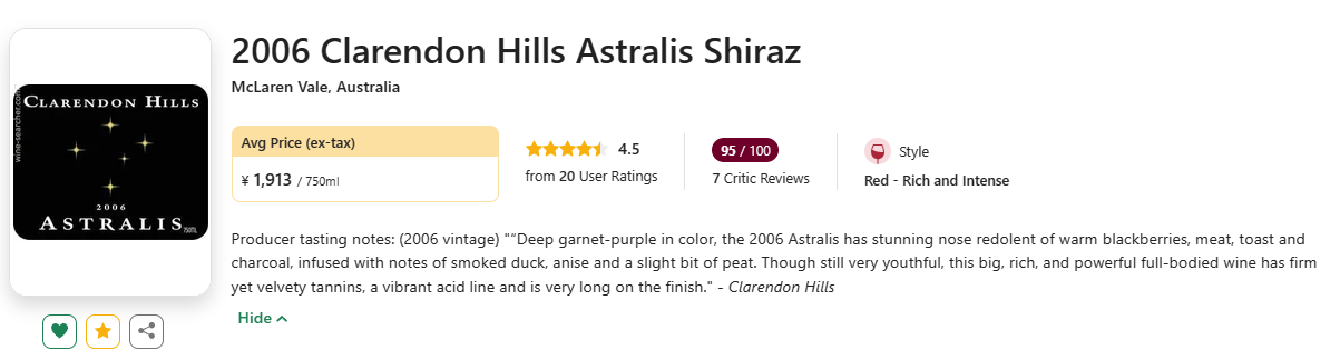 这款大名鼎鼎的星光园是酒庄旗舰款,来自位于McLaren Vale的特级园“星光园(Astralis)”,也是酒庄至好的葡萄园。