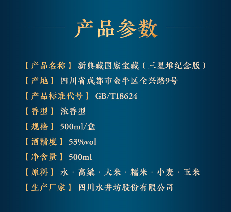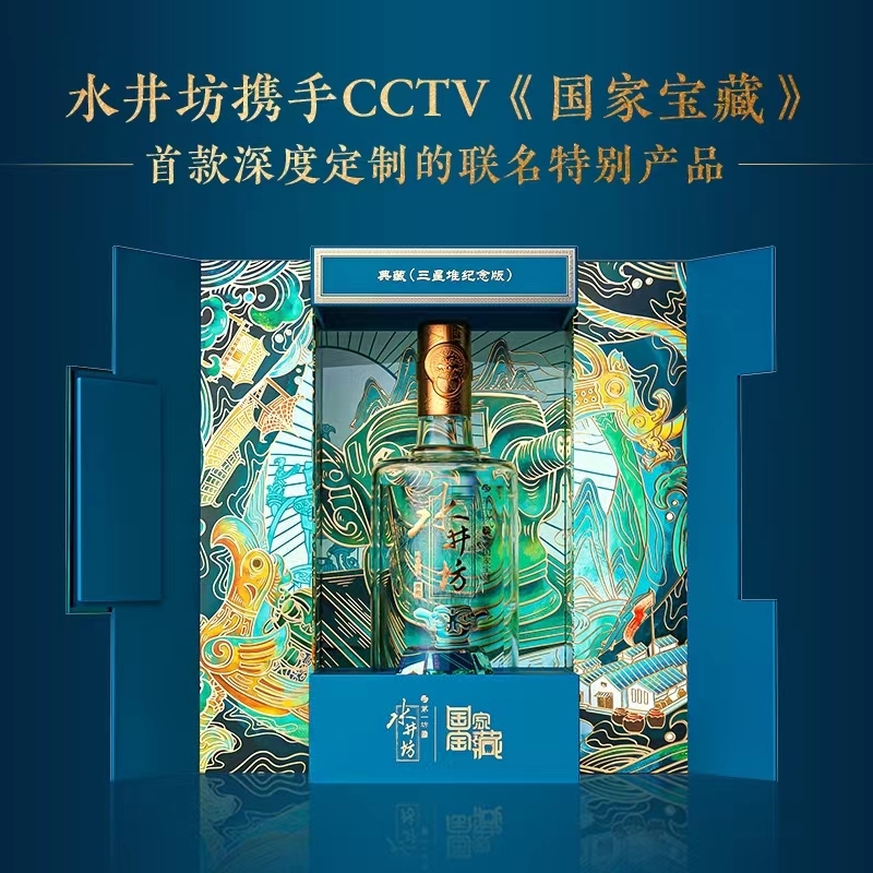 集天府酿艺大成的水井坊携手CCTV《国家宝藏》,首款深度定制的联名特别产品,53度浓香型典藏国家宝藏( 三星堆纪念版)水井坊酒。