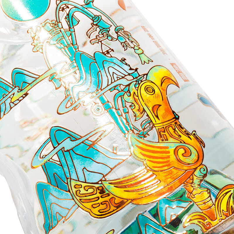 这款联名典藏版的设计堪称一绝。四平八稳的别致礼盒封面选用稳重的石黄色,象征巴蜀陡峭山势的倔强筋骨;打开盒盖,宛如室外桃园般瑰丽天府之美直冲视觉神经,青川环绕,美不胜收。而印有三星堆镇馆之宝—纵目面具的瓶身则端坐正中,瑰丽神秘。
