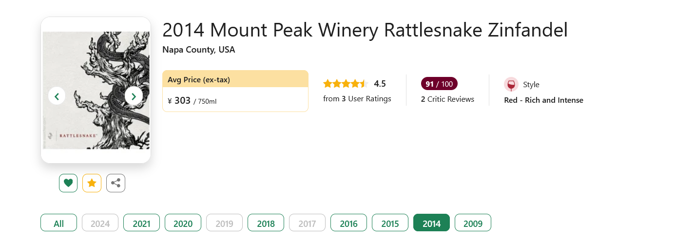 【国均8.2折!全球前三名庄旗下,大年“响尾蛇”仙粉黛!】Mount Peak Winery Rattlesnake Zinfandel 2014