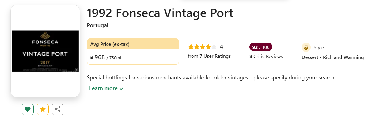【国均8.2折!WS百大第四,传世之作年份波特!】Fonseca Vintage Port 1992