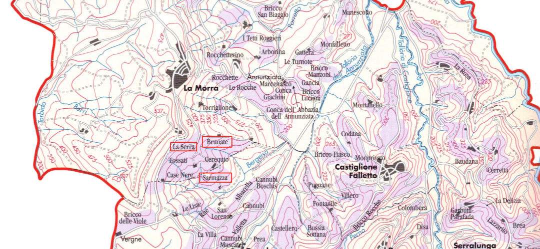 Sarralunga d'Alba:本村葡萄园的石灰岩含量比其它四个村子来得高,葡萄园面积排名第二名。本村的酒则被认为是最丰富饱满又有力的。