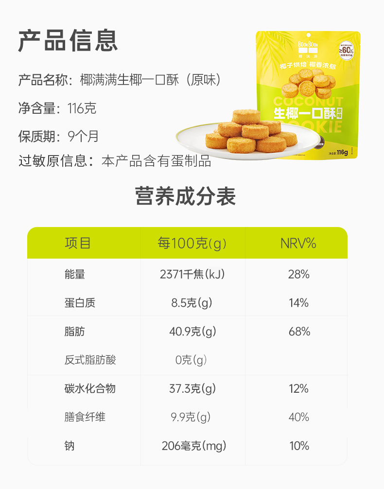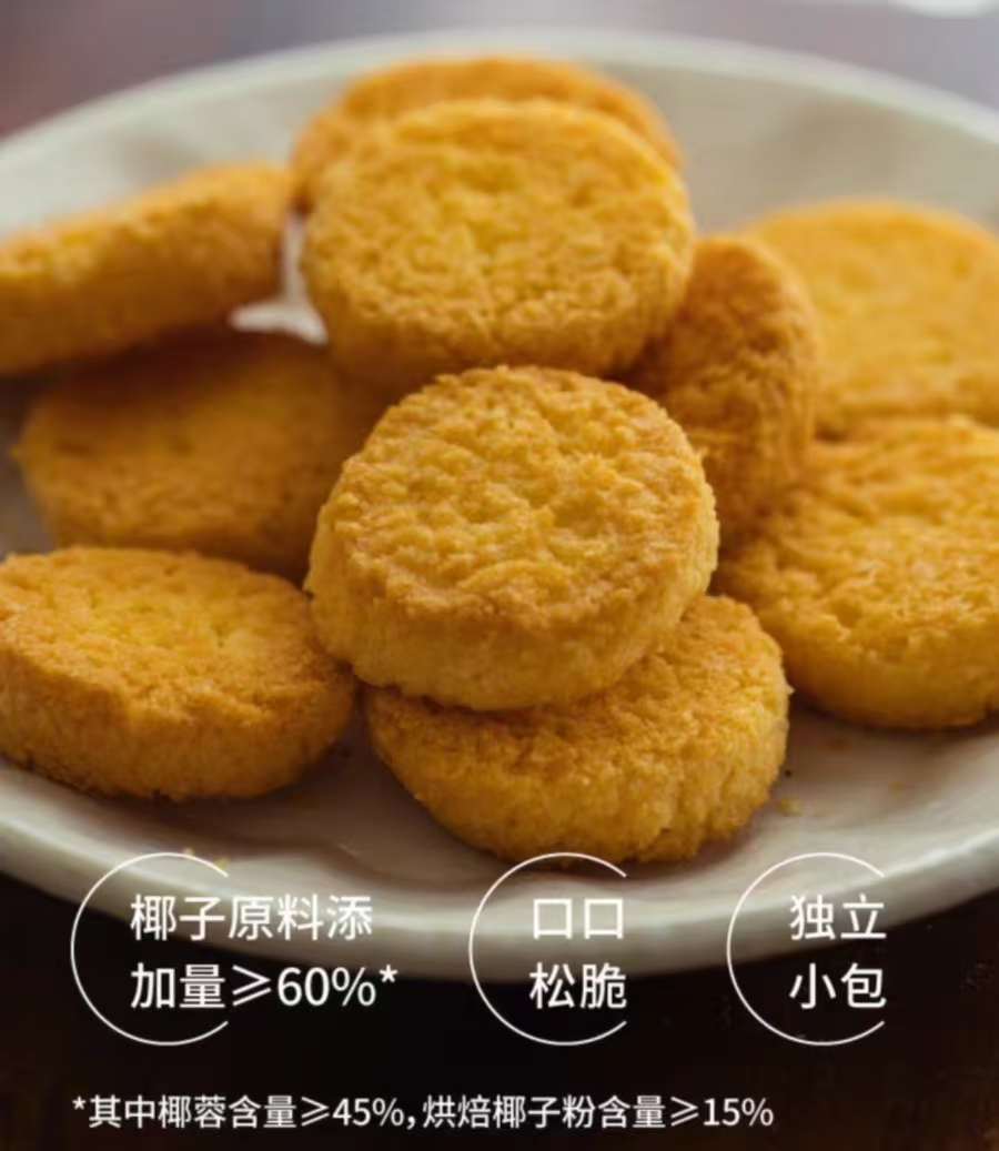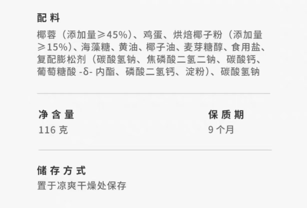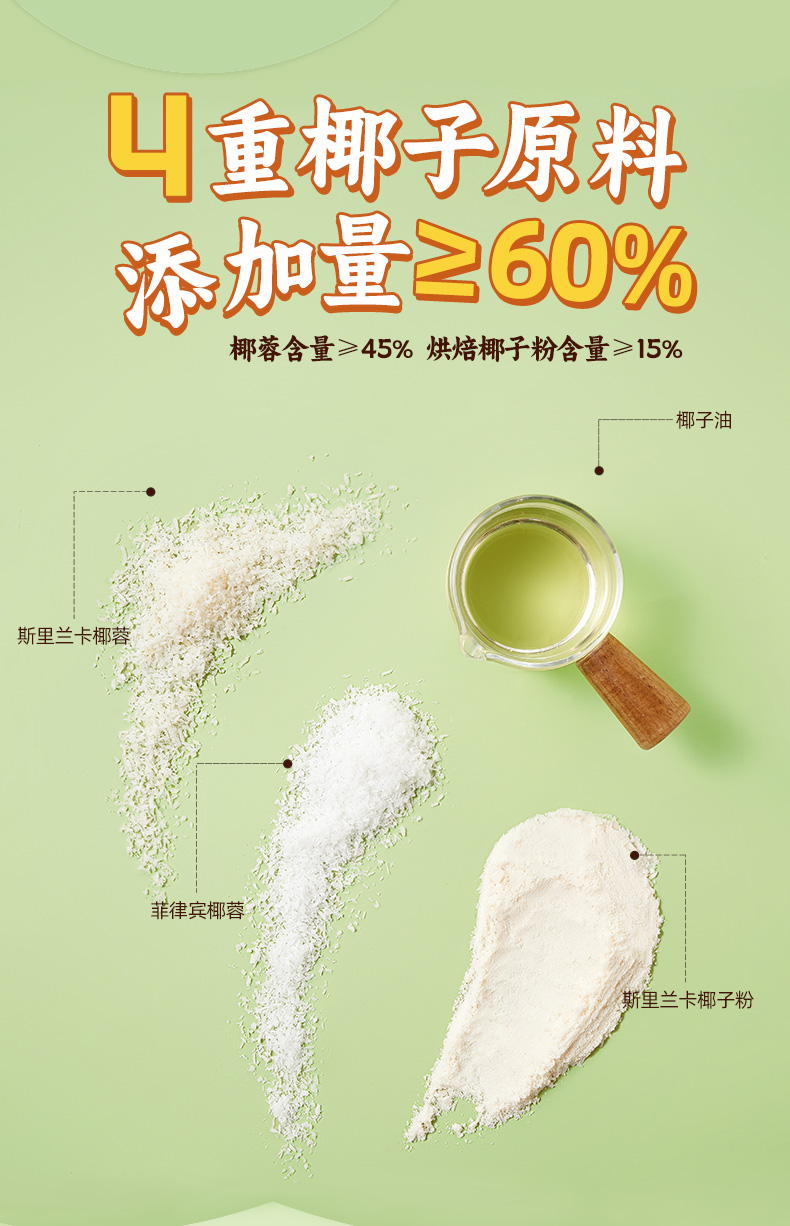 主打一个超浓椰香!加入斯里兰卡椰蓉、菲律宾椰蓉、斯里兰卡椰子粉、椰子油四重椰子原料,添加量≥60%!!