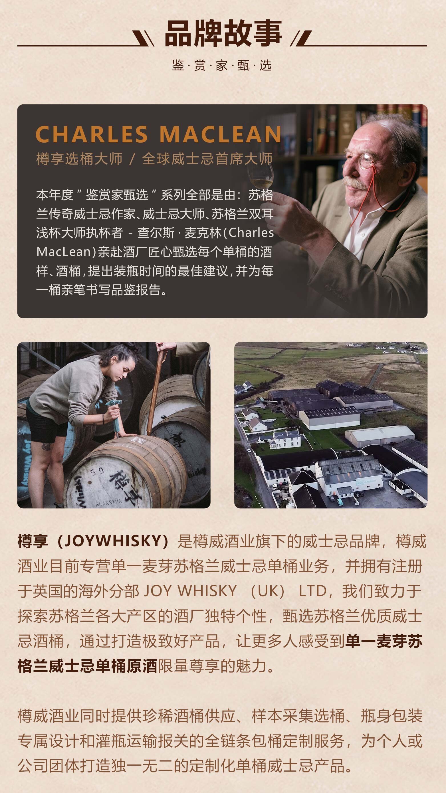 “鉴赏家甄选”是樽享威士忌品牌旗下系列酒款,主要涵盖苏格兰产区的知名酒厂,全部以单桶原桶酒精强度灌瓶;