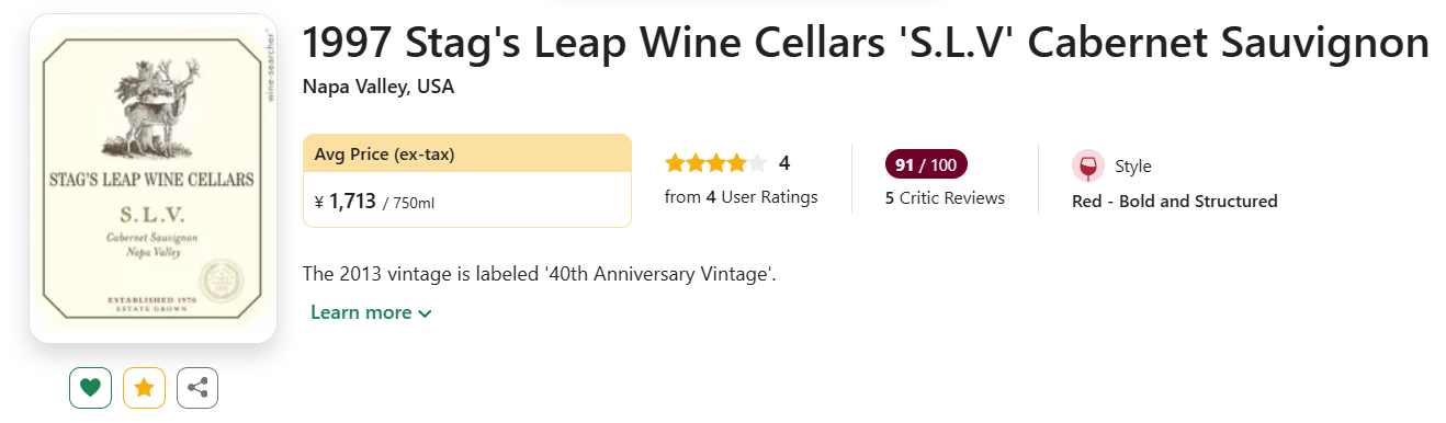【低均好价!纳帕膜拜鹿跃庄,“巴黎审判”夺魁之星!】Stag's Leap Wine Cellars 'S.L.V' Cabernet Sauvignon 1997