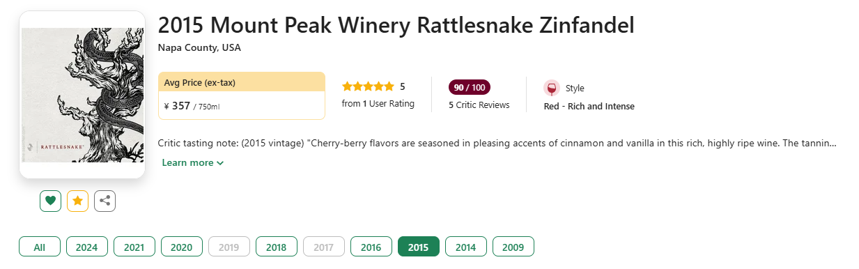 这款“Rattlesnake”响尾蛇仙粉黛,2015年份适逢WS 产区Excellent大年加持,斩获Tastings 93、WA 91、WS 91、CT 91等名家高分!