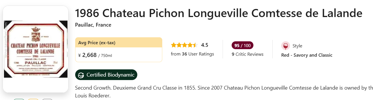 【国均9折!WS百大第9,满分老年份女爵正牌!】Chateau Pichon Longueville Comtesse de Lalande 1986