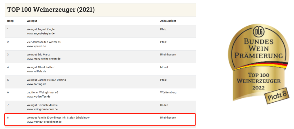值得一提的是,酒庄在2021年德国农业协会(DLG-Bundesweinprämierung)评选出的百大酒庄榜单当中位列第八名!还获得美食美酒指南(Feinschmecker Weinguide)中的 FFF推荐指数,荣膺莱茵-普法尔茨州大州荣誉奖!