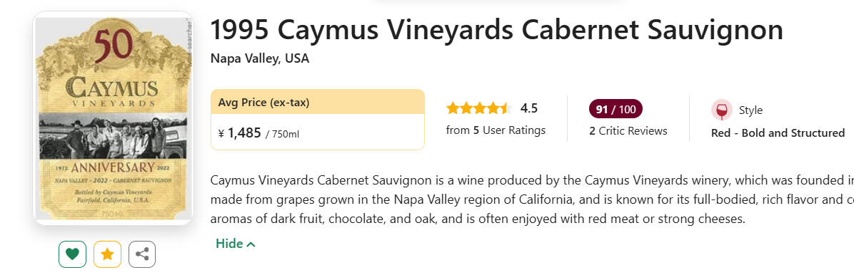 【国均7.4折!加州膜拜名庄,出彩老年份赤霞珠!】Caymus Vineyards Cabernet Sauvignon 1995