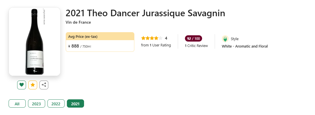 这款Savagnin的风格与Vincent Dancer勃艮第酒保持一致,而非汝拉地区的氧化黄酒风格,勃艮第爱好者闭眼入!