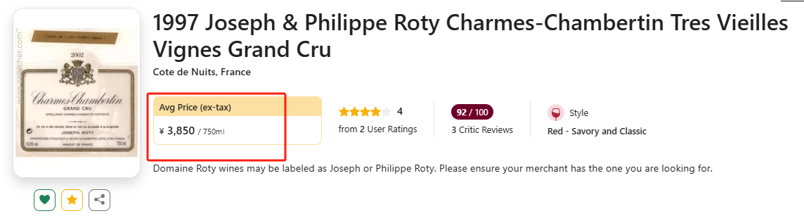 酒云今天上架的便是老藤版本的Charmes-Chambertin,出色,量少,着实很难拿到,我们的价格还能做到低均350+!正值黄金适饮期的1997老年份,老饕们一定不能错过啊!