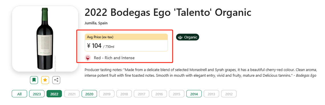 2022年份斩获JS 90分,2023 The Global Organic & Vegan Wine Masters 铜奖,国均7.6折,单支不到80,超高性价比,日常配餐美滋滋!