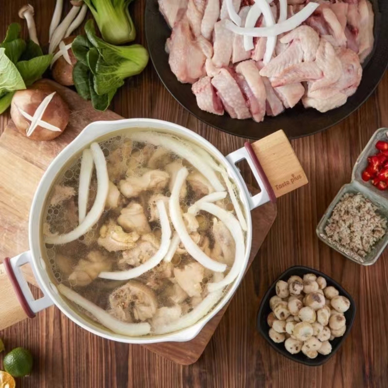 3、锅底煮沸,放鸡肉、马蹄,5分钟开锅,吃鸡先喝汤