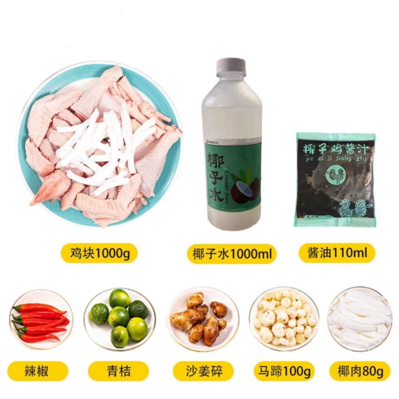 【贮存条件】-18℃冷冻贮存(鸡肉/椰子水/椰肉条) 0-4℃冷藏贮存(马蹄/金桔/辣椒/沙姜/酱油)