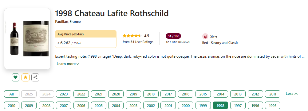 1998年甄稀老年份,阿歇特葡萄酒指南3星特别推荐!RP 96、Vinous 96、WS 95、Vinum 18……多项高分奠定实力基础!低均好价,不容错过!