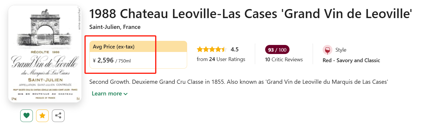 【白菜价波尔多!国均7.7折!超二雄狮正牌,准满分老年份!】Chateau Leoville-Las Cases 'Grand Vin de Leoville' 1988