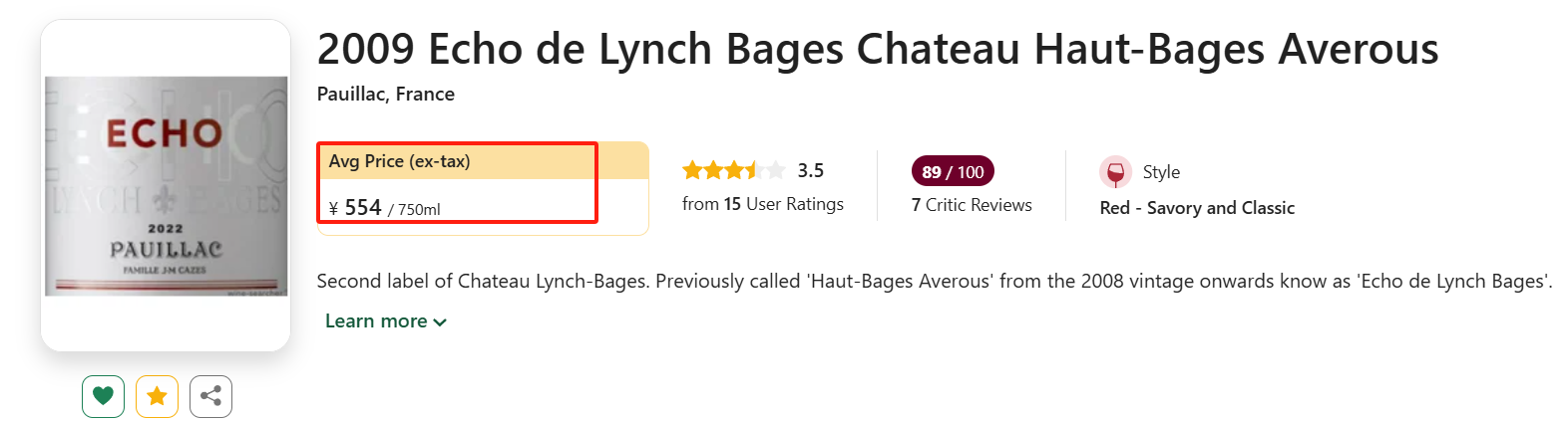 【白菜价波尔多!国均6.6折!超二名庄靓次伯,传奇大年副牌回响!】Echo de Lynch Bages Chateau Haut-Bages Averous 2009