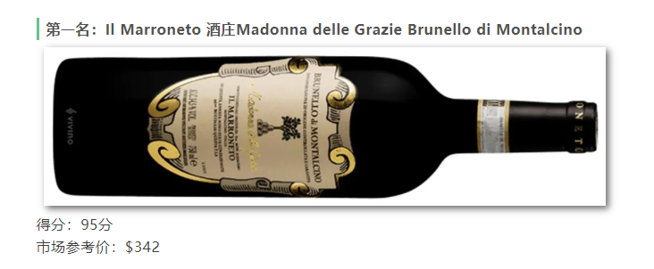 《葡萄酒鉴赏家》选中的唯一一款作为20世纪12大葡萄酒的意大利葡萄酒为1955年的布鲁内洛•金发圣人珍藏干红葡萄酒。