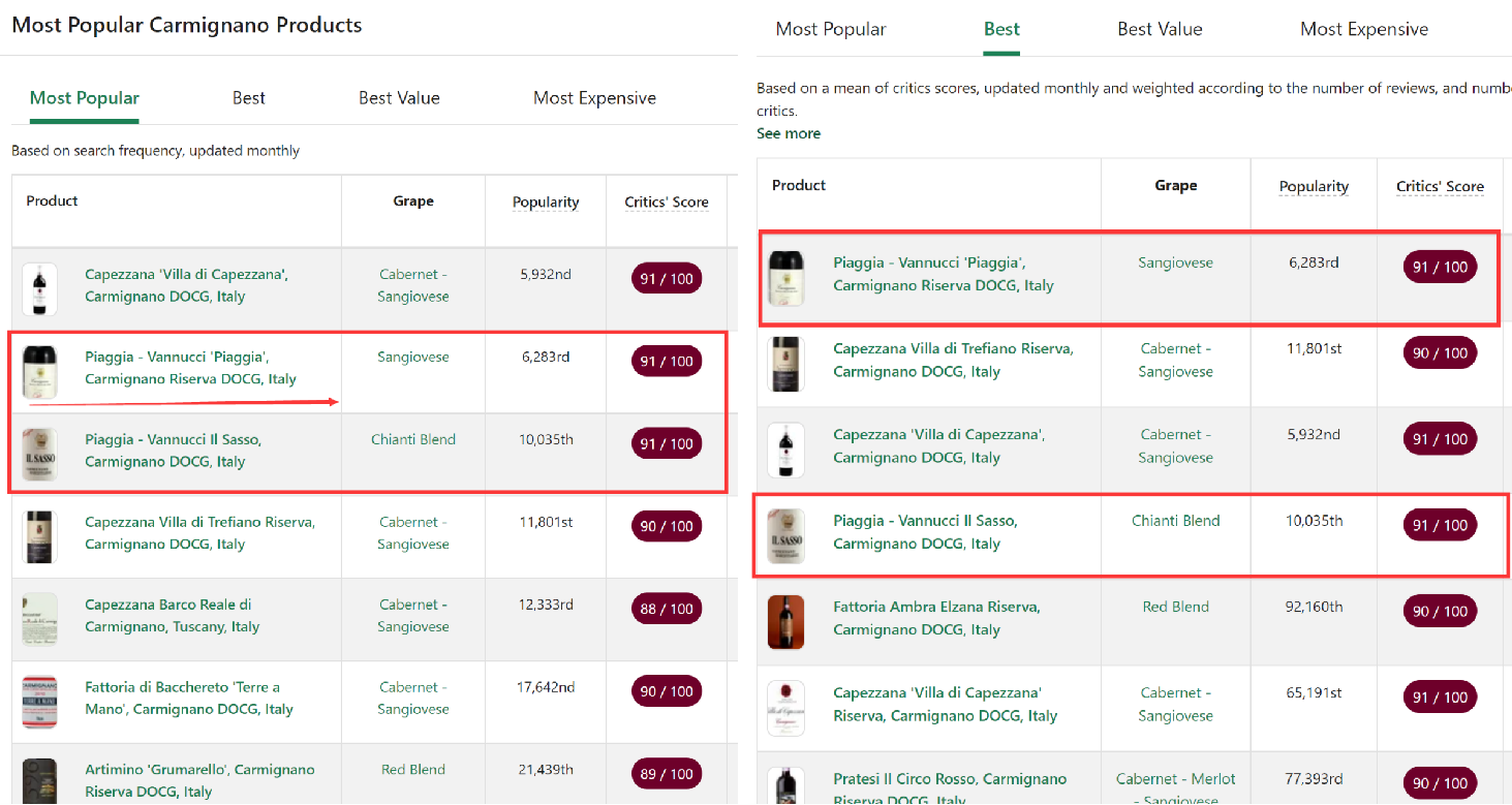 在Wine-Searcher收录的Carmignano葡萄酒生产商当中,无论是在“Most Popular”,还是在“Best”、“Best Value”排行榜单中,Piaggia旗下的葡萄酒都稳居前三,彰显出了全世界葡萄酒爱好者对Piaggia的喜爱和追捧。