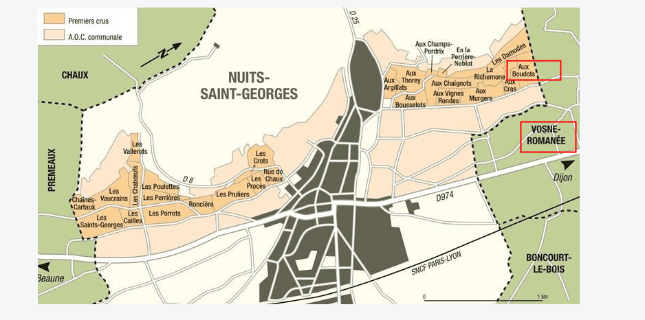 Aux Boudots位于Nuits-Saint-Georges村北端,它的北边界与Vosne-Romanne葡萄园接壤。该葡萄园是本村一级葡萄园中很受人喜爱的一级园之一。该葡萄园酿制的酒,口感丰富、结构饱满,并有很好的窖藏潜力。