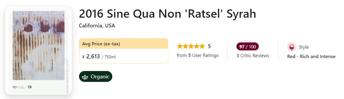 【低均好价!拍卖会常客SQN,满分珍酿“谜题”西拉!】Sine Qua Non 'Ratsel' Syrah 2016